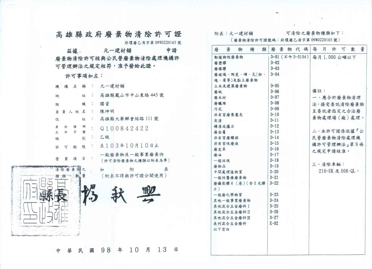 廢棄物清除許可證號碼:府環廢乙清字第0980220165號